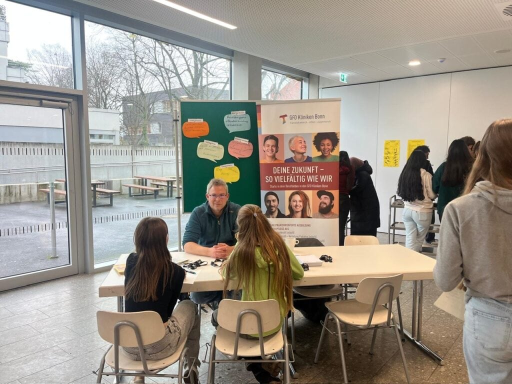 In der vergangenen Woche hat – traditionell – unsere hausinterne Berufsinformationsbörse stattgefunden. Hier stellen unsere KURS-Partner ihr Angebot vor, sondern auch unsere Eltern berichten aus ihrem Berufsalltag. So entsteht ein ganz besonderer Einblick, denn oft verlaufen Berufsbiographien nicht geradlinig, sondern zuweilen ist man überrascht, was man beispielsweise mit einem Studium der Psychologie in einem Wirtschaftsunternehmen macht oder mit welcher Ausbildung man an welcher Stelle Hausmeister geworden ist und dort mit dem Ausbildungsberuf gar nicht mehr so viel zu tun hat.