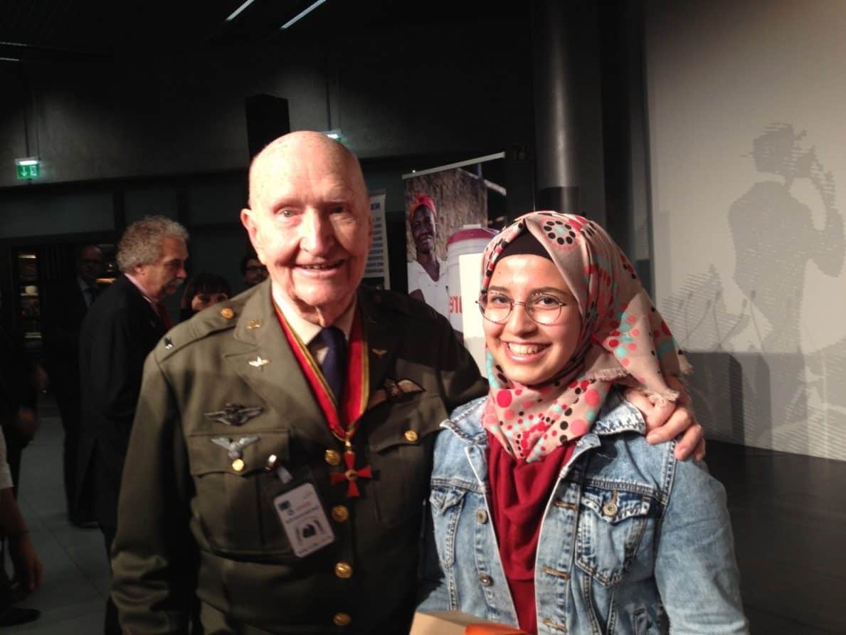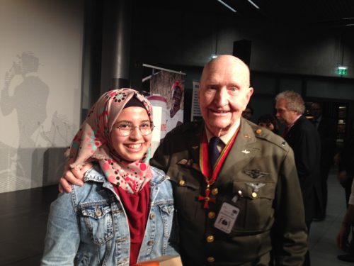 Am Donnerstag, 24. November 2016 feierte die Hilfsorganisation CARE ihr 70-jähriges Jubiläum im Technikmuseum in Berlin. Zu dieser großen Jubiläumsgala war auch unser Profilkurs Care eingeladen. Neben Rita Süssmuth, Dilek Kolat (Bürgermeisterin und Senatorin für  Arbeit, Integration und Frauen Berlin) und Dr. Bärbel Kofler (Menschenrechtsbeauftragte der Bundesrepublik) standen auch unsere Schüler/innen auf der Bühne und präsentierten ihre Arbeit aus dem Profilkurs sowie ihr neues Projekt – unser internationales Kochbuch – erarbeitet mit unseren VK-Schülern. An dem Abend hatten unsere Schüler/innen auch die Möglichkeit den Ehrengast des Abends, den Rosinenbomber-Pilot Gail Seymour Halvorsen kennenzulernen. Als Pilot der US-Luftwaffe während der Berliner Luftbrücke 1948/49 befestigte er Süßigkeiten an Fallschirme und warf sie über wartende Kinder auf den Trümmerbergen Neuköllns ab. Unsere Schülerinnen und Schüler hatten viel Saß dabei, sich mir dem sehr humorvollen Gail Halverson zu unterhalten. Er erzählte von seinen Erlebnissen als Pilot der Berliner Luftbrücke und wie er zum Namen „Mr Wigglywing“ kam (Onkel Wackelfügel). Dabei entstand dieses wunderschöne Bild, das unsere ehemalige Schülerin Ayaa und den Candy-Bomber zeigt