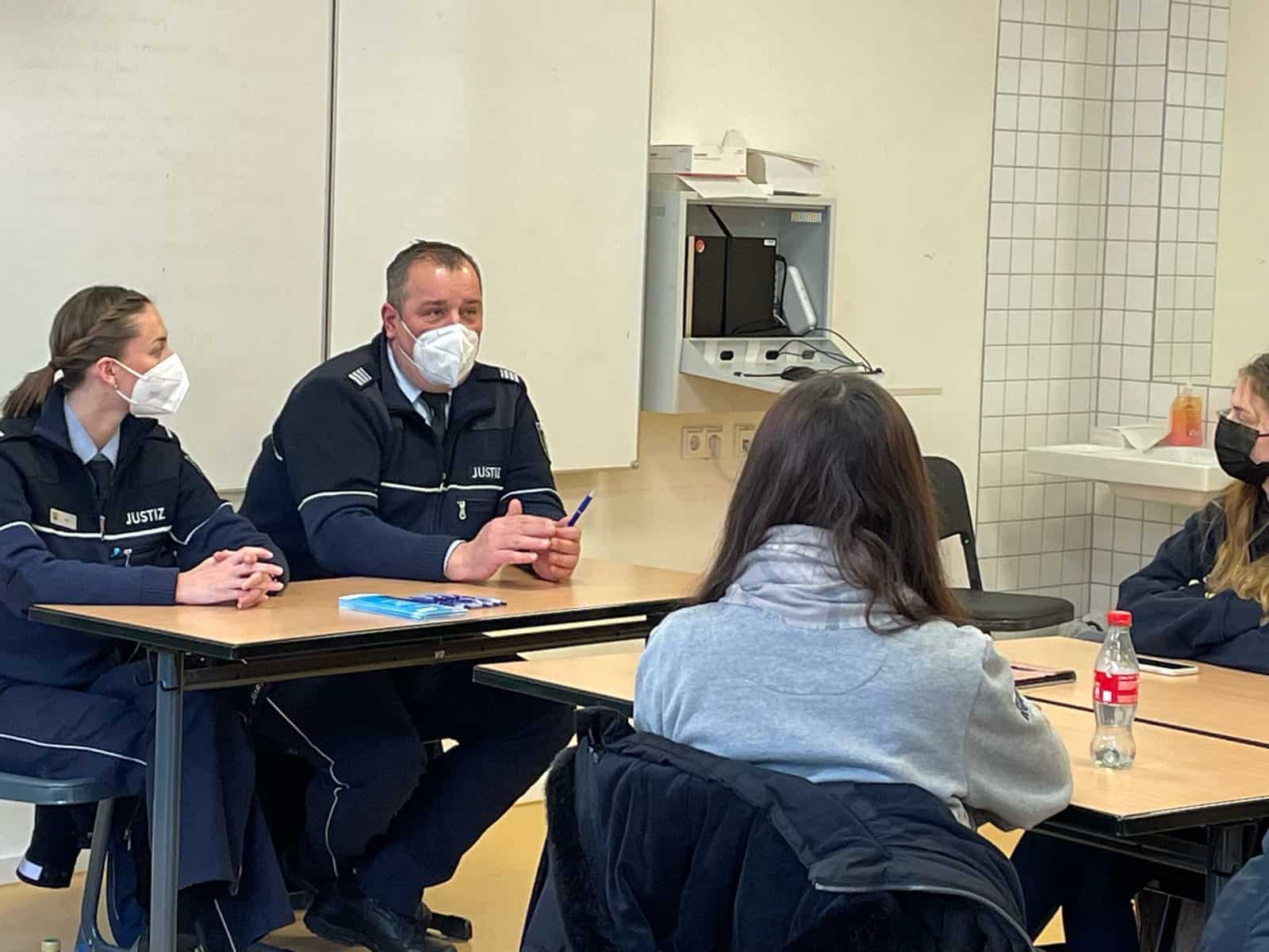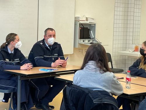 Wir haben uns zuvor im Unterricht mit Kohlbergs Theorie der Moralentwicklung beschäftigt und in diesem Zusammenhang auch über die Resozialisierungsmaßnahmen in einer JVA gesprochen. Es hat uns sehr gefreut mit der JVA über diese Maßnahmen ins Gespräch zu gehen und unsere offenen Fragen zu klären. Es fielen Fragen über die verschiedensten Themen, vom Alltag der Beamten und der Insassen, über Besucherzeiten und Kontrollverfahren bis hin zu Gewaltausbrüchen unter den Gefangenen. Geschichten zu Situationen, die die Beamte besonders emotional beschäftigt haben, durften wir teilweise auch erfahren. Alle unsere Fragen wurden locker und verständnisvoll beantwortet und auch die Stimmung während des Gesprächs war sehr angenehm. Einige von uns zeigten sich schon sehr interessiert, was die Tätigkeit des JVA-Beamten angeht. Diesbezüglich haben wir die Ausbildungsmöglichkeiten an der JVA umfangreich dargestellt bekommen.