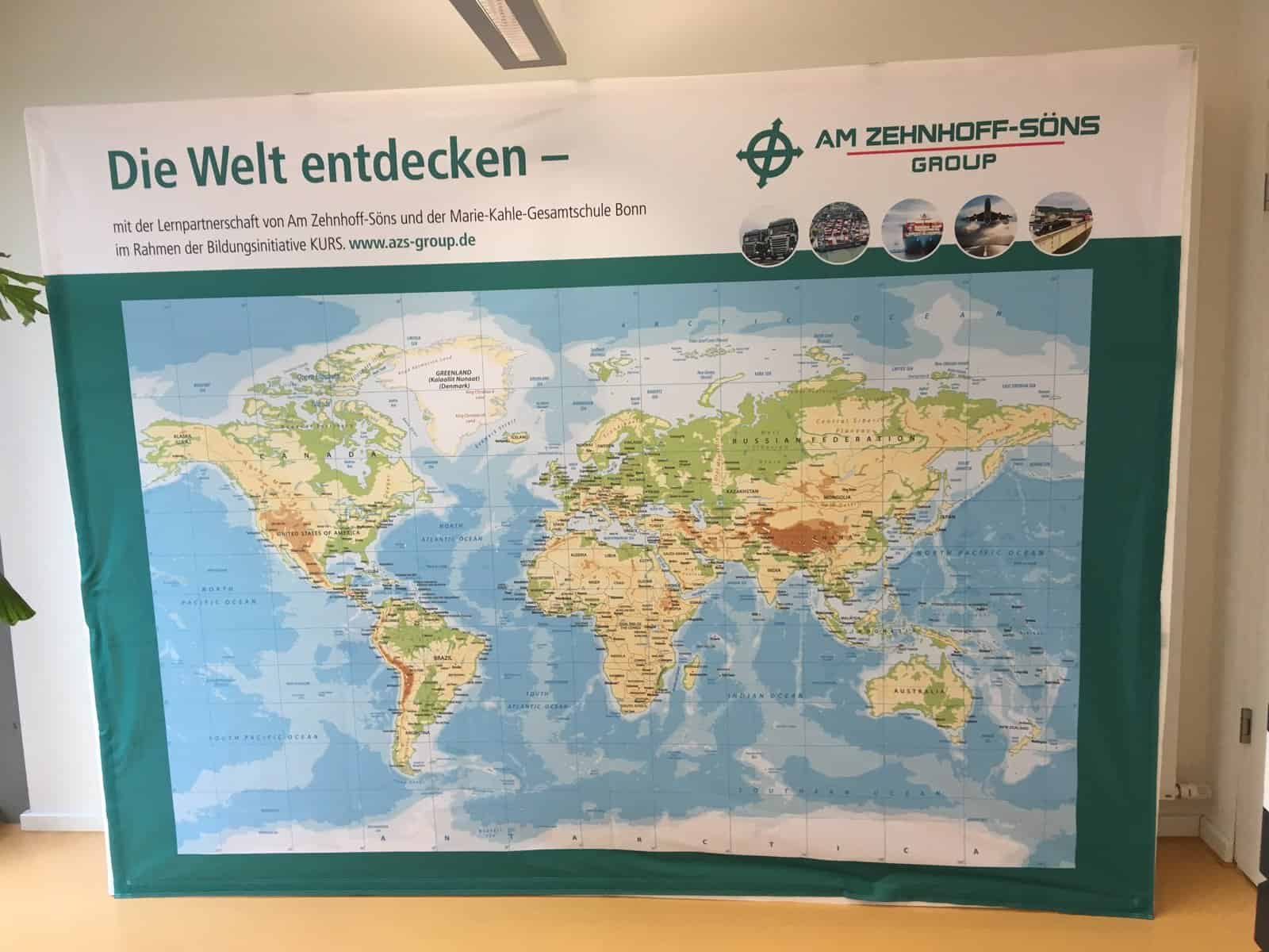 Wir freuen uns sehr über eine große, transportable Stand-Weltkarte, die von „Am Zehnhoff Söns“ gesponsert wurde.