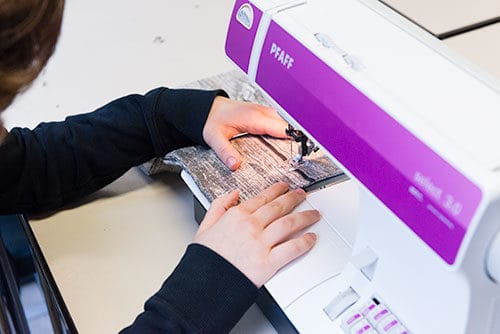 Gemeinsam einigten wir uns auf die Fertigung der zurzeit sehr modernen „Sportbeutel“. Aus einem stylischen Printstoff (Holzplankenoptik) wurde Schritt für Schritt ein individueller, angesagter Rucksack; vom Zuschnitt, über die ersten Nähte bis hin zum finalen Stich. Die Schülerinnen und Schüler lernten im Weiteren das Einschlagen von Ösen und konnten so auch die Trageriemen in ihr genähtes Objekt einfädeln. Alle unterstützten sich untereinander auf ihre Weise und brachten so die ersten eigenen Näharbeiten zum Abschluss.