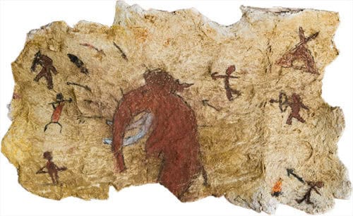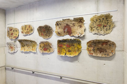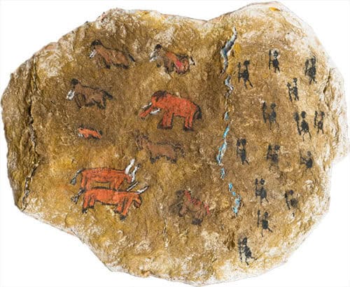 In der Marie-Kahle-Gesamtschule hingegen hängen Originale! Zu bestaunen sind Werke der Klasse 5c und 5d, die fächerübergreifend das Thema „Steinzeit“ unter die Lupe genommen haben. Sowohl im Gesellschaftslehreunterricht als auch im Kunstunterricht wurden zeitgleich Inhalte und Techniken vermittelt. Im Kunstunterricht sprachen wir ausführlich über die Höhlen von Lascaux, betrachteten die vor über 15.000 Jahren entstandenen Jagdszenen und machten uns gemeinsam Gedanken zur kreativen Nachahmung. Dabei war die größte Herausforderung, einen Höhlenuntergrund zu schaffen. Die SuS erkannten schnell, dass eine Höhlenwand farblich häufig dem Sichtbeton unseres neuen Gebäudes entspricht, jedoch keineswegs so glatt geschliffen daher kommt. Lösungen mussten her und wurden gefunden. Aus alten Zeitungen und Wasser erstellten wir einen Brei, der unter manueller Bearbeitung klein „gematscht“ wurde. Anschließend wurden Wasser und Zeitungsbrei durch ein Handtuch gegeben; zurück blieb die sogenannte „Pulpe“. Diese vermengt mit Tapetenkleister und Holzleim ergab eine gut knetbare Masse, die sich problemlos auf große Pappen ausrollen/ausbreiten ließ und stabil trocknet (kein Bröseln). Innerhalb einer Woche waren die Höhlenwände „durchgetrocknet“ und zeigten ein völlig neues Antlitz (Gesicht). Beim Verdunsten des restlichen Wassers verformten sich die Pappen.